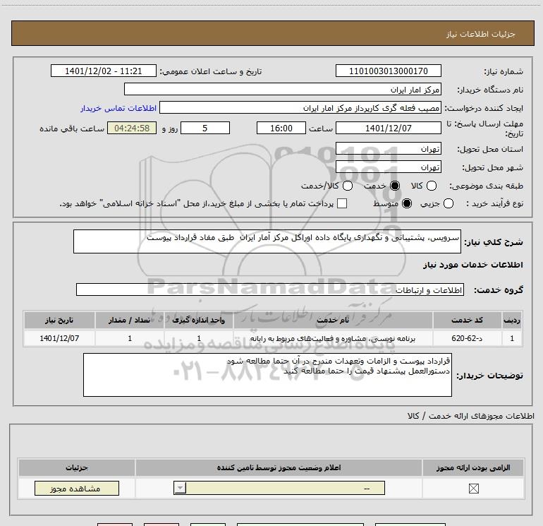 شرح کلی نیاز: سرویس، پشتیبانی و نگهداری پایگاه داده اوراکل مرکز آمار ایران طبق مفاد قرارداد پیوست
