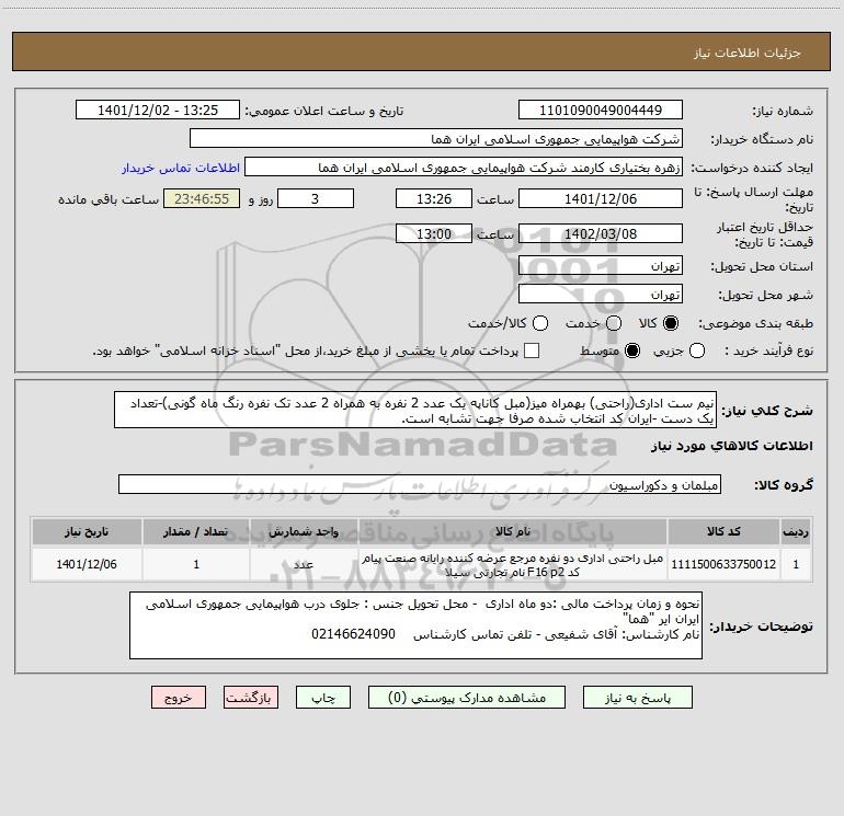 شرح کلی نیاز: نیم ست اداری(راحتی) بهمراه میز(مبل کاناپه یک عدد 2 نفره به همراه 2 عدد تک نفره رنگ ماه گونی)-تعداد یک دست -ایران کد انتخاب شده صرفا جهت تشابه است.