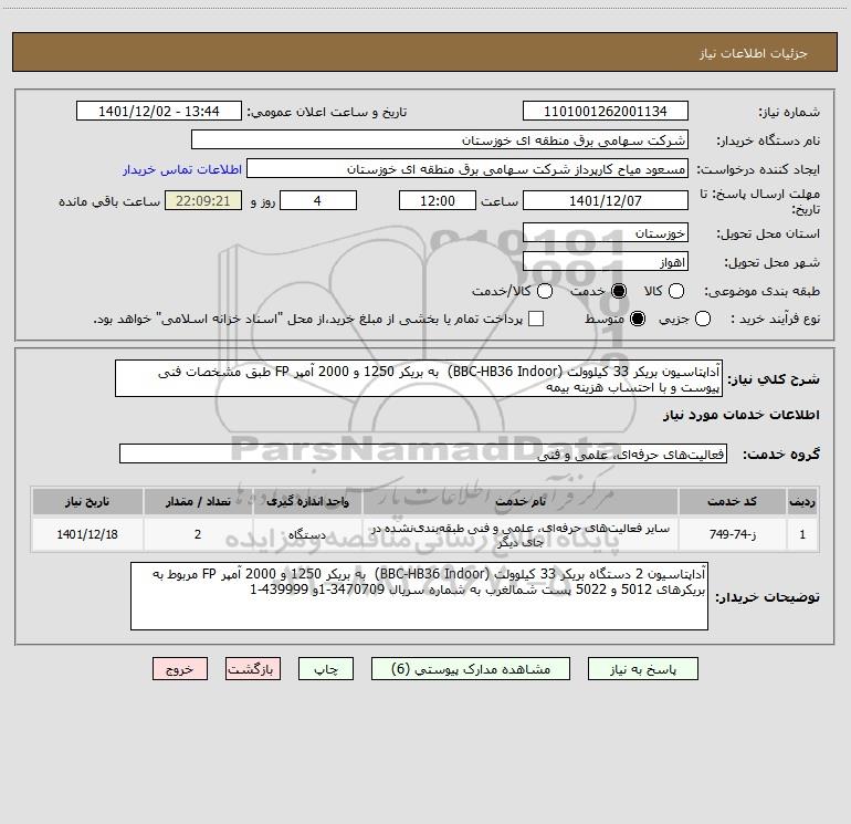 شرح کلی نیاز: آداپتاسیون بریکر 33 کیلوولت (BBC-HB36 Indoor) به بریکر 1250 و 2000 آمپر FP طبق مشخصات فنی پیوست و با احتساب هزینه بیمه