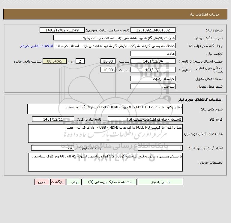نام دستگاه خریدار:شرکت پالایش گاز شهید هاشمی نژاد استان خراسان رضوی