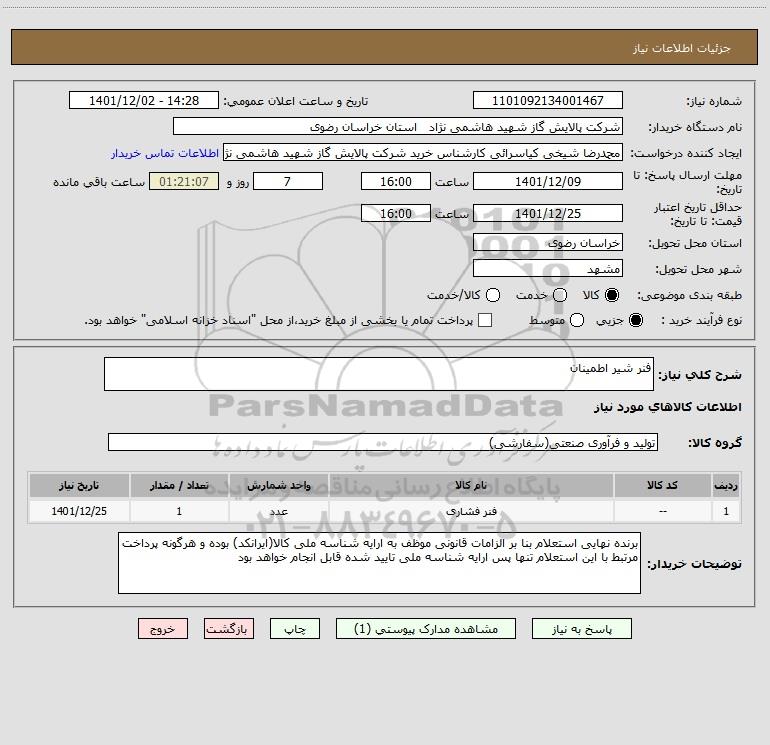 نام دستگاه خریدار:شرکت پالایش گاز شهید هاشمی نژاد استان خراسان رضوی
