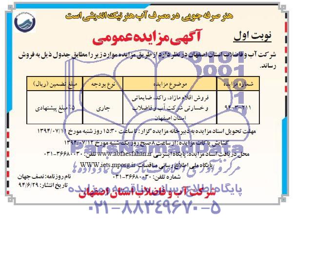 شرکت آب و فاضلاب استان اصفهان در نظر دارد از طریق مزایده مورد زیر را مطابق جدول ذیل به فروش رساند.