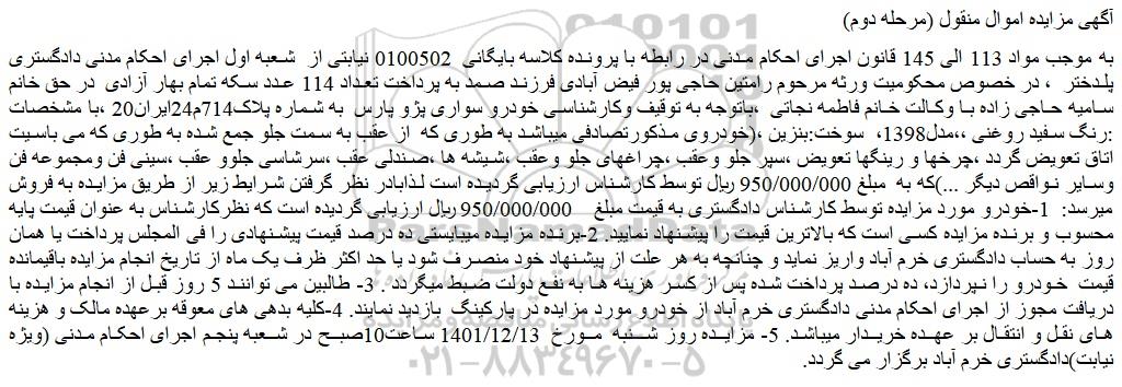 به موجب مواد 113 الی 145 قانون اجرای احکام مدنی در رابطه با پرونده کلاسه بایگانی 0100502 نیابتی از شعبه اول اجرای احکام مدنی دادگستری پلدختر ، در خصوص محکومیت ورثه مرحوم رامتین حاجی پور فیض آبادی فرزند صمد به پرداخت تعداد 114 عدد سکه تمام بهار آزادی در حق خانم سامیه حاجی زاده با وکالت خانم فاطمه نجاتی ،باتوجه به توقیف وکارشناسی خودرو سواری پژو پارس به شماره پلاک714م24ایران20 ،با مشخصات :رنگ سفید روغنی ،،مدل1398، سوخت:بنزین ،(خودروی مذکورتصادفی میباشد به طوری که از عقب به سمت جلو جمع شده به طوری که می باسیت اتاق تعویض گردد ،چرخها و رینگها تعویض ،سپر جلو وعقب ،چراغهای جلو وعقب ،شیشه ها ،صندلی عقب ،سرشاسی جلوو عقب ،سینی فن ومجموعه فن وسایر نواقص دیگر ...)که به مبلغ 950/000/000 ریال توسط کارشناس ارزیابی گردیده است لذابادر نظر گرفتن شرایط زیر از طریق مزایده به فروش میرسد: 1-خودرو مورد مزایده توسط کارشناس دادگستری به قیمت مبلغ 950/000/000 ریال ارزیابی گردیده است که نظرکارشناس به عنوان قیمت پایه محسوب و برنده مزایده کسی است که بالاترین قیمت را پیشنهاد نمایید. 2-برنده مزایده میبایستی ده درصد قیمت پیشنهادی را فی المجلس پرداخت یا همان روز به حساب دادگستری خرم آباد واریز نماید و چنانچه به هر علت از پیشنهاد خود منصرف شود یا حد اکثر ظرف یک ماه از تاریخ انجام مزایده باقیمانده قیمت خودرو را نپردازد، ده درصد پرداخت شده پس از کسر هزینه ها به نفع دولت ضبط میگردد . 3- طالبین می توانند 5 روز قبل از انجام مزایده با دریافت مجوز از اجرای احکام مدنی دادگستری خرم آباد از خودرو مورد مزایده در پارکینگ بازدید نمایند. 4-کلیه بدهی های معوقه برعهده مالک و هزینه های نقل و انتقال بر عهده خریدار میباشد. 5- مزایده روز شنبه مورخ 1401/12/13 ساعت10صبح در شعبه پنجم اجرای احکام مدنی (ویژه نیابت)دادگستری خرم آباد برگزار می گردد.