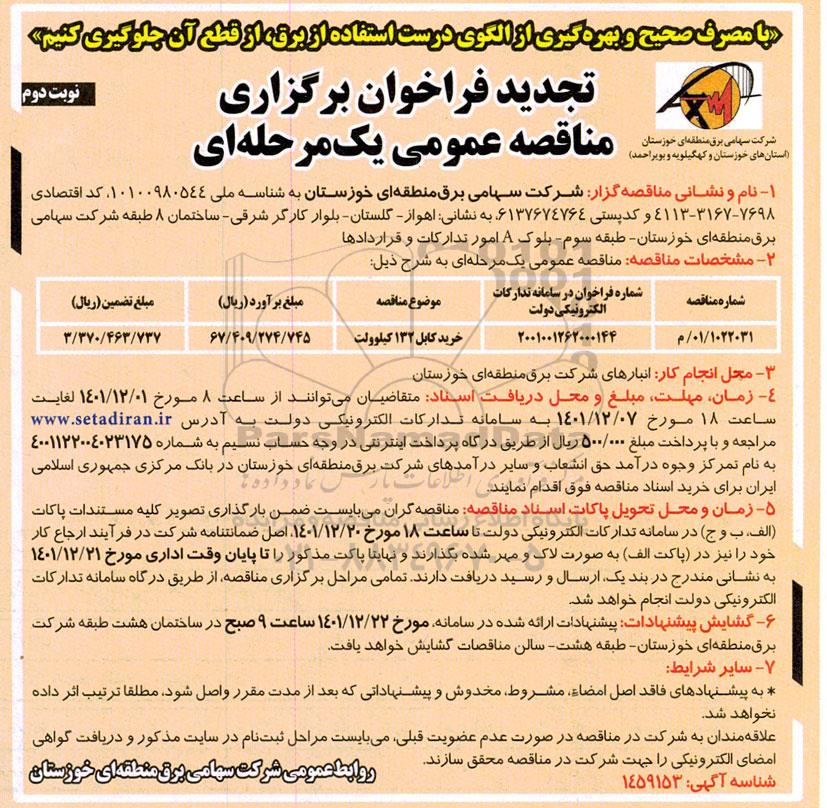 تجدید مناقصه خرید کابل 132 کیلوولت - نوبت دوم از کلیه افراد متخصص و شرکتها واجد شرایط دعوت به عمل میآید در مناقصه با کد خبرگزاری پارس نماد: 5549535 شرکت نمایند.