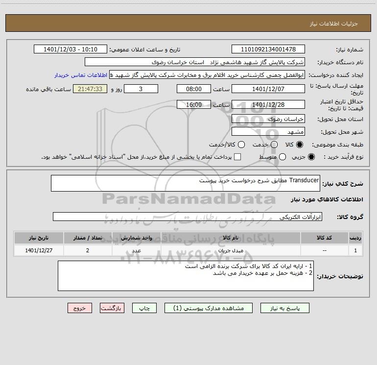 شرح کلی نیاز: Transducer مطابق شرح درخواست خرید پیوست