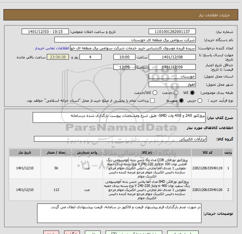 شرح کلی نیاز: پروژکتور 240 و 400 وات SMD- طبق شرح ومشخصات پیوست بارگذاری شده درسامانه