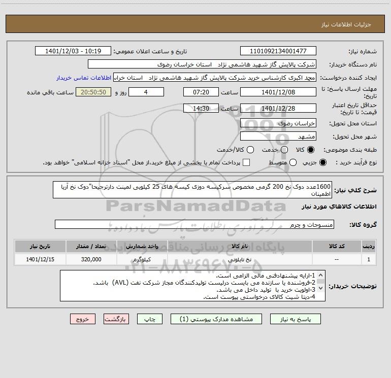 نام دستگاه خریدار:شرکت پالایش گاز شهید هاشمی نژاد استان خراسان رضوی