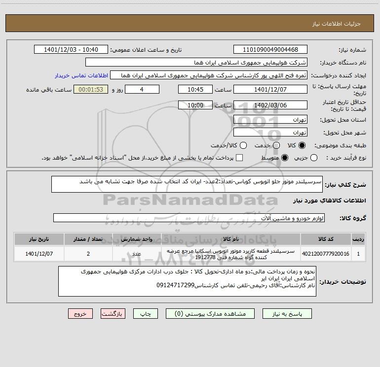 شرح کلی نیاز: سرسیلندر موتور جلو اتوبوس کوباس-تعداد:2عدد- ایران کد انتخاب شده صرفا جهت تشابه می باشد