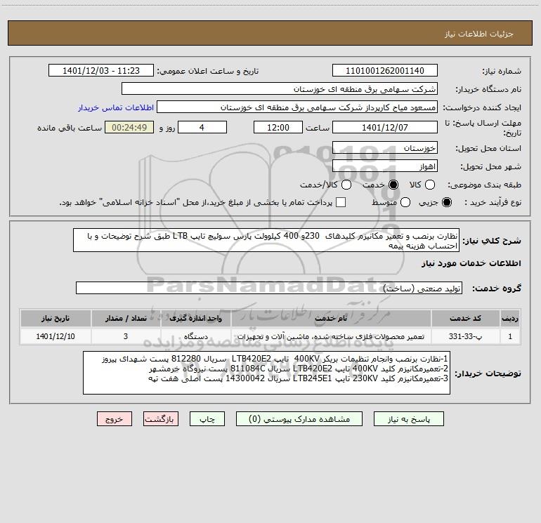 شرح کلی نیاز: نظارت برنصب و تعمیر مکانیزم کلیدهای 230و 400 کیلوولت پارس سوئیچ تایپ LTB طبق شرح توضیحات و با احتساب هزینه بیمه