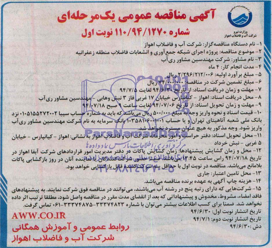 نام دستگاه مناقصه گزار: شرکت آب و فاضلاب اهواز