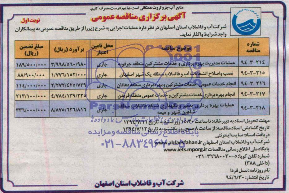 217-3-94  انجام بهره برداری خدمات مشترکین و خدمات عمومی منطقه فریدن