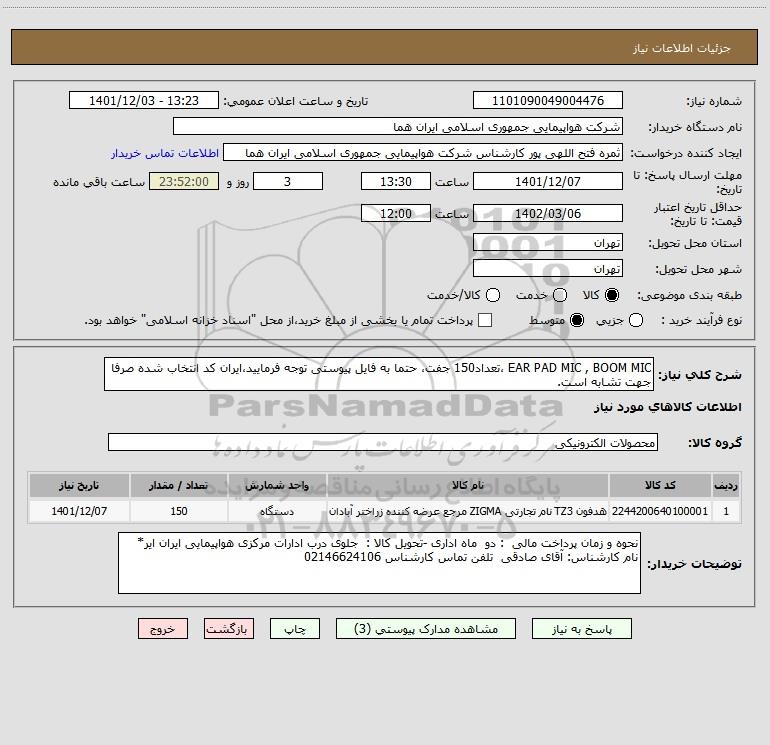 شرح کلی نیاز: EAR PAD MIC , BOOM MIC ،تعداد150 جفت، حتما به فایل پیوستی توجه فرمایید،ایران کد انتخاب شده صرفا جهت تشابه است.