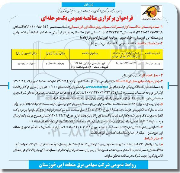 | 01/1012137/ م | 2001001262000146 | خرید مقره های سیلیکونی خط 132 کیلوولت باغملک 400- دیشموک (قطعه اول) | 31.860.018.663 | 2.093.000.933 |