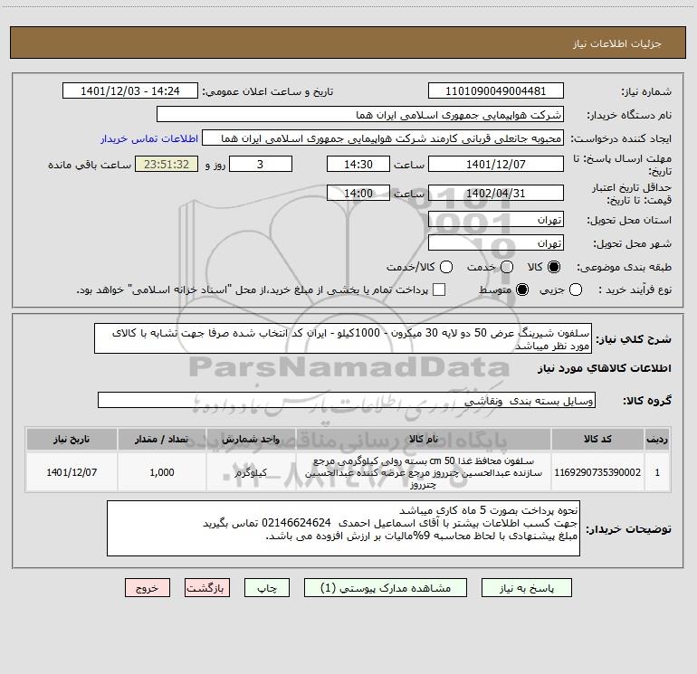 شرح کلی نیاز: سلفون شیرینگ عرض 50 دو لایه 30 میکرون - 1000کیلو - ایران کد انتخاب شده صرفا جهت تشابه با کالای مورد نظر میباشد