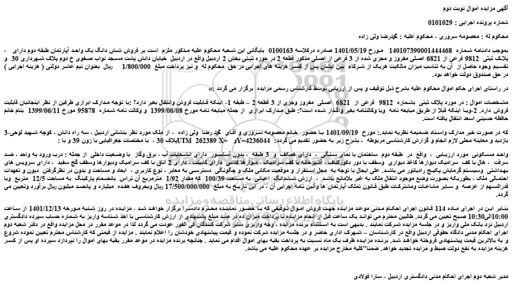 ،  بموجب دادنامه شماره  140107390001444468   مورخ 1401/05/19 صادره درکلاسه 0100163  بایگانی این شعبه محکوم علیه مذکور ملزم  است بر فروش شش دانگ یک واحد آپارتمان طبقه دوم دارای  پلاک ثبثی  9812 فرعی از 6821 اصلی مفروز و مجزی شده از 3 فرعی از اصلی مذکور قطعه 2 در حوزه ثبتی بخش 2 اردبیل واقع در اردبیل  خیابان دانش پشت مسجد نواب صفوی خ دوم پلاک شهرداری 30  و تقسیم وجوه حاصل از  آن به تناسب میزان مالکیت هریک از شرکاء  بین ایشان پس از کسر هزینه های اجرایی در حق  محکوم له  و نیز پرداخت مبلغ  1/800/000     ریال  بعنوان نیم عشر دولتی ( هزینه اجرایی ) در حق صندوق دولت خواهد بود.