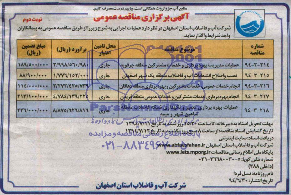 217-3-94  انجام بهره برداری خدمات مشترکین و خدمات عمومی منطقه فریدن