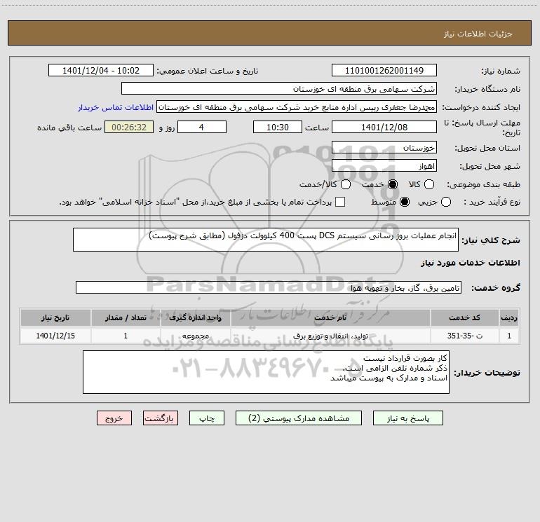 شرح کلی نیاز: انجام عملیات بروز رسانی سیستم DCS پست 400 کیلوولت دزفول (مطابق شرح پیوست)