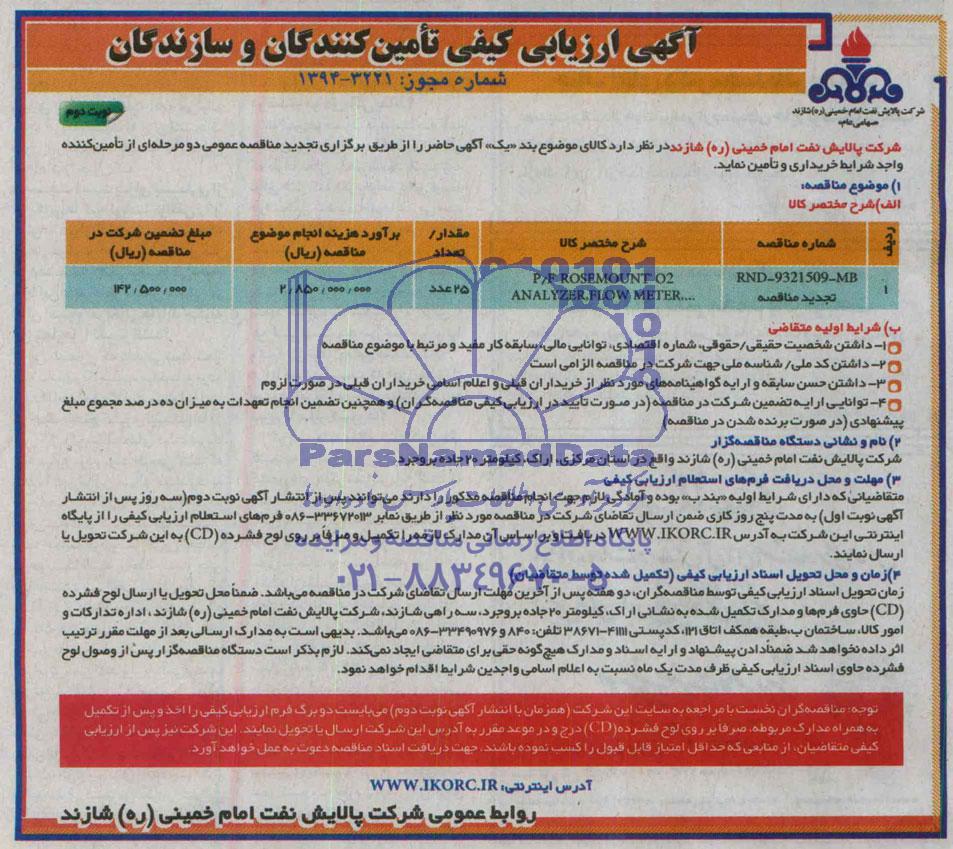 تجدید مناقصه P/F ROSEMOUNT O2 ANALYZER FLOW METER |