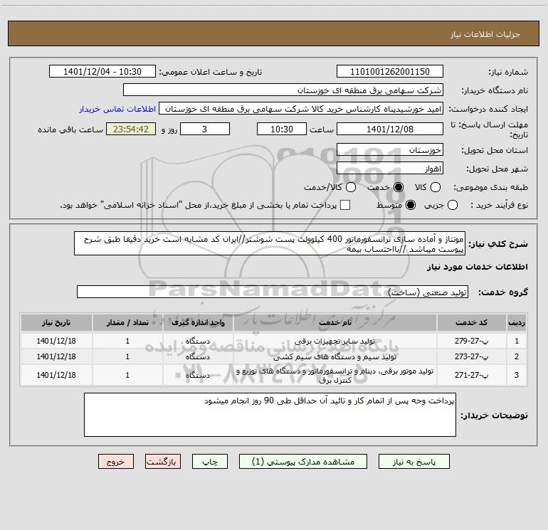شرح کلی نیاز: مونتاژ و آماده سازی ترانسفورماتور 400 کیلوولت پست شوشتر//ایران کد مشابه است خرید دقیقا طبق شرح پیوست میباشد //بااحتساب بیمه