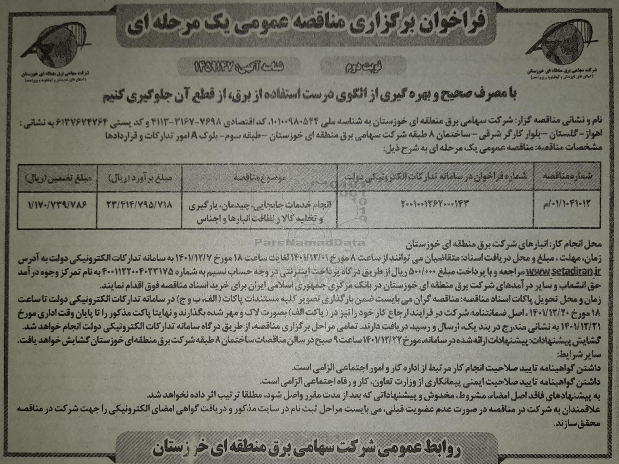 | 01/1041012 / م | 2001001262000143 | انجام خدمات جابجایی، چیدمان، بارگیری و تخلیه کالا و نظافت انبارها و اجناس | 23.414.795.718 | 1.170.739.786 |