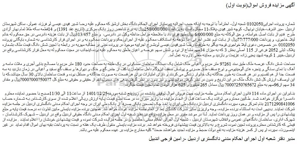شماره پرونده اجرایی0102050 شعبه اول- احتراماً با توجه به اینکه حسب اجرائیه پیوستیاز اجرای اتحکام دادگاه بخش ارشق که محکوم علیه رضا شیر محمدی عیسی لو فرزند عمولر، ساکن شهرستان اردبیل -میر اشرف-خیابان نونهال- کوچه شیر محمدی-پلاک11 محکوم است به پرداخت 250/000/000ریال به نرخ شاخص روز بانک مرکزی (تاریخ عقد 1391) و 14قطعه سکه طلا تمام بهار آزادی طرح قدیم از بابت اصل خواسته، و حق الوکاله به مبلغ 6/000/000 ریال طبق قرار داد با ملاحظه مراحل مداخله وکیل در دادرسی، و مبلغ 313/457ریال از بابت هزینه دادرسی در حق محکوم له خانم لیلا خاجوی، و پرداخت 77/777/000ریال از بابت نیم عشر اجرایی، با توجه به استنکاف محکوم علیه از اجرای حکم و پرداخت محکوم به و در اجرای قرار کارشناسی به شماره بایگانی پرونده 0102050 ،در خصوص دعوی لیلا خواجوی قوجه بیگلو به طرفیت رضا شیرمحمدی عیسی لوبشرح اجراییه موجود در پرونده مبنی بر مطالبه مهریه در رابطه با تعیین شش دانگ قیمت ملک بشماره پلاک ثبتی 2052 فرعی از 115 اصلی بخش 3 که به میزان 34سهم مشاع از نود و شش سهم عرصه و اعیان متعلق به محکوم علیه بوده،اینجانب در معیت محکوم له به محل قرار کارشناسی واقع در اردبیل-خیبر 1 کوچه شهید یحیی زاده عزیمت و بازدید و معاینه محلی لازم به عمل آمد.