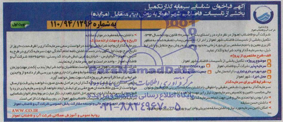 شرکت آب و فاضلاب اهواز در نظر دارد تکمیل بخشی از تاسیسات فاضلاب شهر اهواز را در ازاء تخصیص پساب تصفیه شده به منظور کاربری معین و با حجم مشخص برای دوره زمانی محدود و معین و به روش بیع متقابل و با شرایط ذیل به سرمایه گذار واجد شرایط واگذار نماید