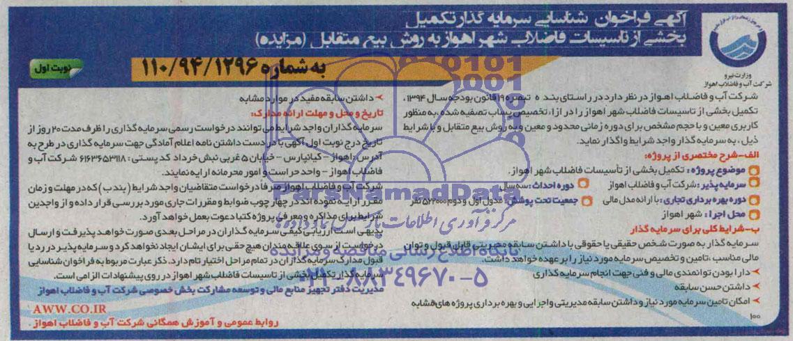 شرکت آب و فاضلاب اهواز در نظر دارد تکمیل بخشی از تاسیسات فاضلاب شهر اهواز را در ازاء تخصیص پساب تصفیه شده به منظور کاربری معین و با حجم مشخص برای دوره زمانی محدود و معین و به روش بیع متقابل و با شرایط ذیل به سرمایه گذار واجد شرایط واگذار نماید