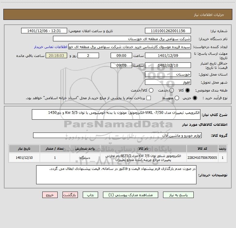 شرح کلی نیاز: الکتروپمپ :پمپیران مدل 7/50- WKL-الکتروموتور: موتوژن با بدنه آلومینیومی با توان Kw 5/5 و دور1450