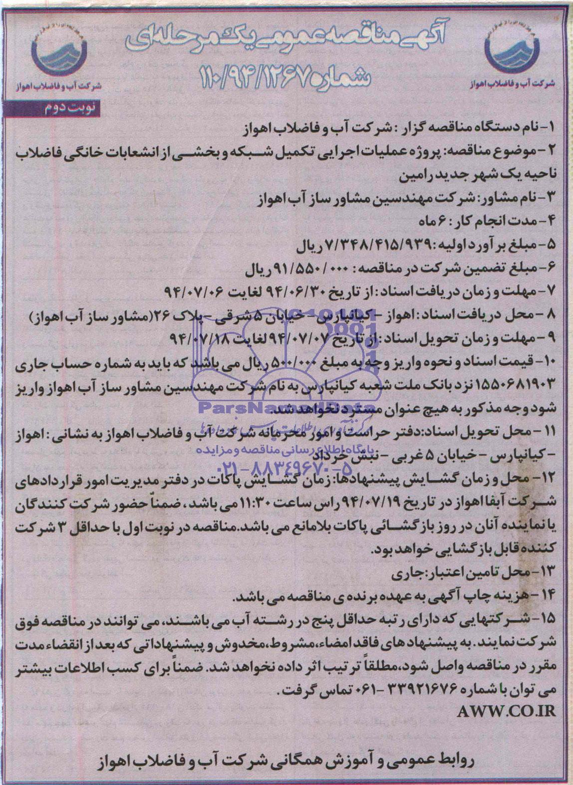 محل و زمان گشایش پیشنهادها: زمان گشایش پاکات در دفتر مدیریت قراردادهای شرکت آبفای اهواز در تاریخ 94.7.19 رأس ساعت 11:30 می باشد. ضمناً حضور شرکت کنندگان یا نماینده آنان در روز بازگشایی پاکات بلامانع می باشد. مناقصه در نوبت اول با حداقل 3 شرکت کننده قابل بازگشایی خواهد بود.