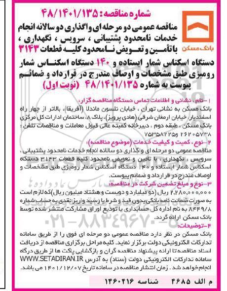 مناقصه عمومی دو مرحله ای واگذاری دوسالانه انجام خدمات نامحدود پشتیبانی، سرویس، نگهداری، با تامین و تعویض نامحدود کلیه قطعات 3143 دستگاه اسکناس شماره ایستاده و 140 دستگاه اسکناس شمار رومیزی طبق مشخصات و اوصاف مندرج در قرارداد و ضمائم پیوست به شماره  48/1401/35  نوبت اول