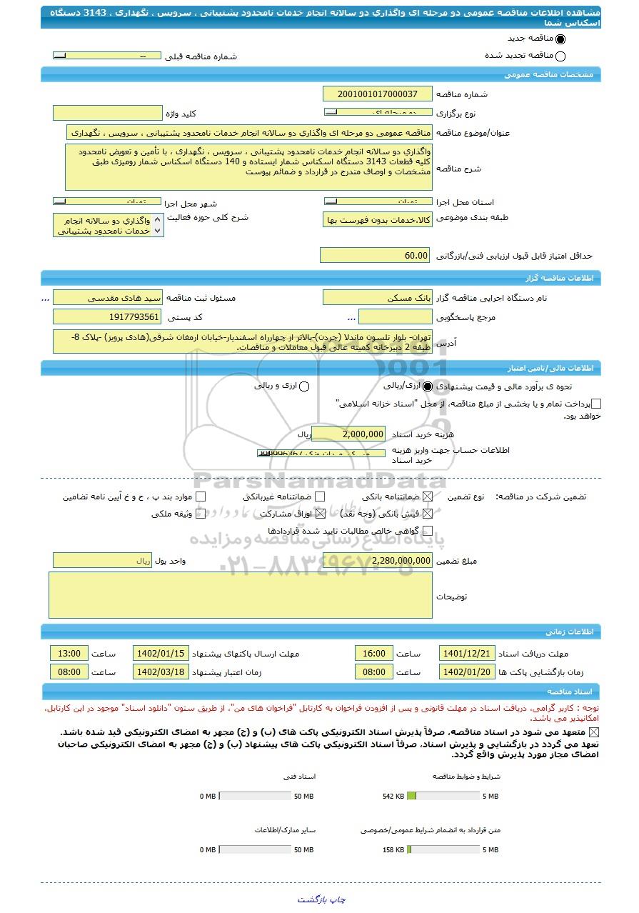 عنوان/موضوع مناقصه | مناقصه عمومی دو مرحله ای واگذاری دو سالانه انجام خدمات نامحدود پشتیبانی ، سرویس ، نگهداری ، 3143 دستگاه اسکناس شما | ||
