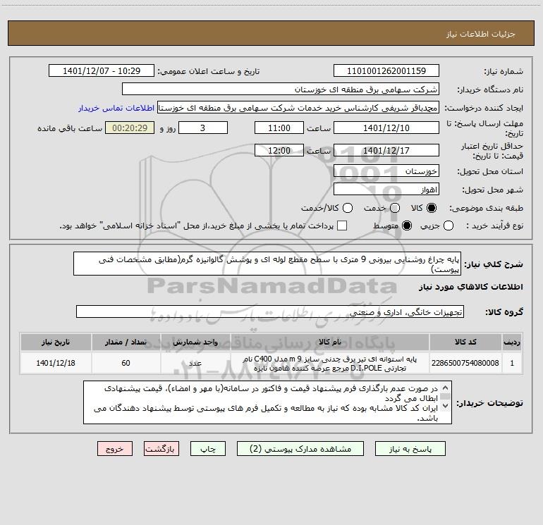شرح کلی نیاز: پایه چراغ روشنایی بیرونی 9 متری با سطح مقطع لوله ای و پوشش گالوانیزه گرم(مطابق مشخصات فنی پیوست)