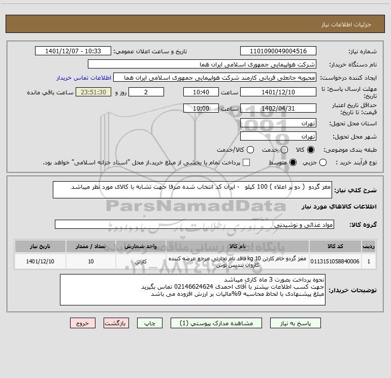 شرح کلی نیاز: مغز گردو ( دو پر اعلاء ) 100 کیلو - ایران کد انتخاب شده صرفا جهت تشابه با کالای مورد نظر میباشد