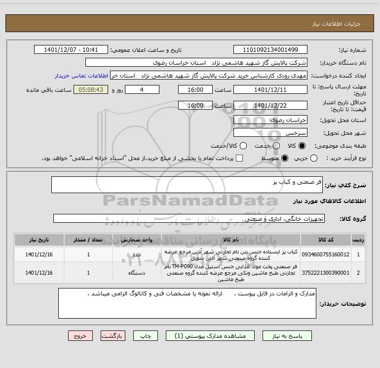 نام دستگاه خریدار:شرکت پالایش گاز شهید هاشمی نژاد استان خراسان رضوی