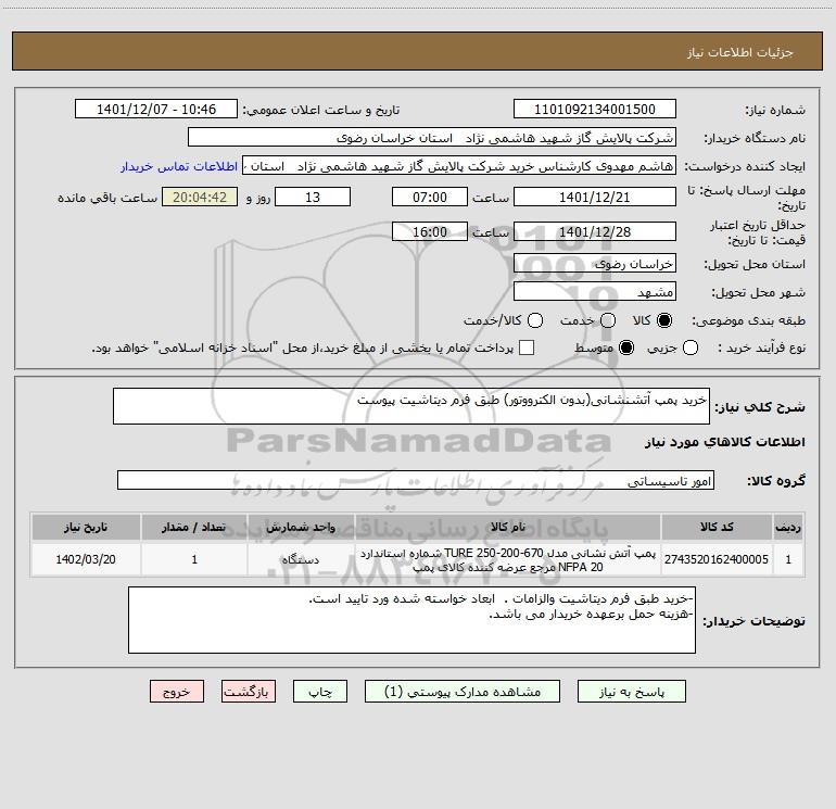 شرح کلی نیاز: خرید پمپ آتشنشانی(بدون الکترووتور) طبق فرم دیتاشیت پیوست