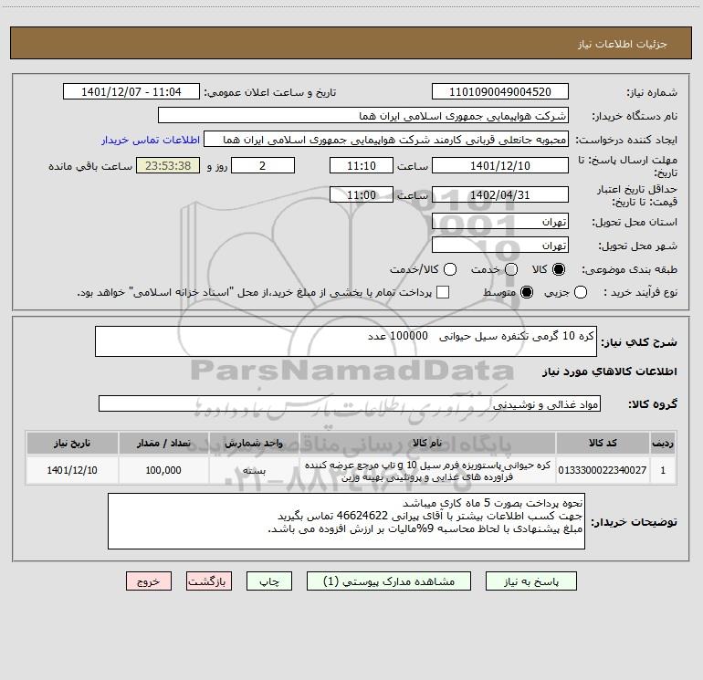 شرح کلی نیاز: کره 10 گرمی تکنفره سیل حیوانی 100000 عدد