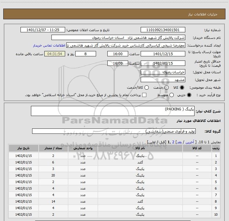 نام دستگاه خریدار:شرکت پالایش گاز شهید هاشمی نژاد استان خراسان رضوی