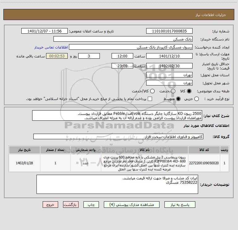 شرح کلی نیاز: 2500 ریبون KO سازگاربا چاپگر دستگاه EvolisمدلPebble مطابق قرارداد پیوست.