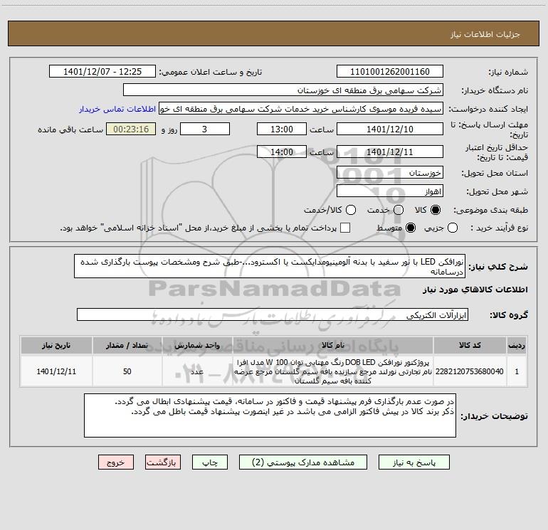 شرح کلی نیاز: نورافکن LED با نور سفید با بدنه آلومینیومدایکست یا اکسترود...-طبق شرح ومشخصات پیوست بارگذاری شده درسامانه