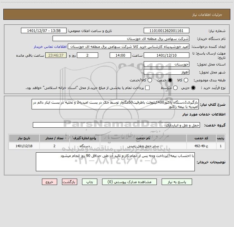 شرح کلی نیاز: بارگیری1دستگاه راکتور400کیلوولت باظرفیت50مگاوار توسط جک در پست امیدیه2 و تخلیه در پست ایثار دائم در امیدیه با بیمه راکتور