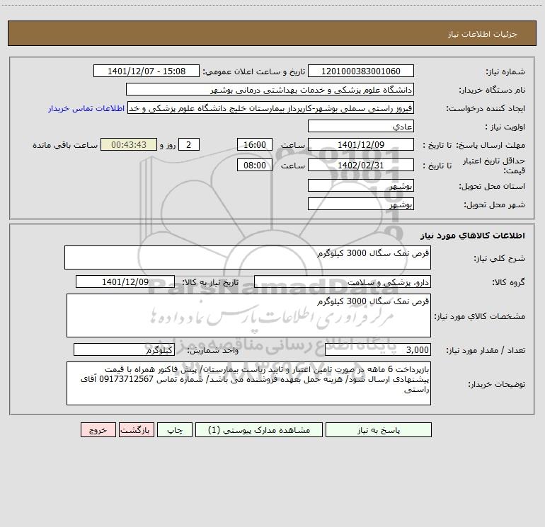 استعلام بها و موضوع استعلام استعلام قرص نمک سگال 3000 کیلوگرم به اطلاع کلیه شرکتها و افراد متخصص واجد شرایط میرساند، آگهی گذار در نظر دارد از طریق استعلام بها، نسبت به انتخاب و دریافت پیشنهادات اقدام نماید. این استعلام با کد آگهی ثبت شده در سامانه خبرگزاری پارس نماد : 5569026 منتشر شده است. مشخصات استعلام : تاریخ شروع استعلام: 1401/12/07 آخرین مهلت ارسال پیشنهاد قیمت : 1401/12/09 و محل اجرای پروژه : استان بوشهر میباشد. استعلام قیمت مورد درخواست : استعلام قرص نمک سگال 3000 کیلوگرم با دستهبندیهای تخصصی و گروه های مرتبط : خدمات و تجهیزات آزمایشگاهی و پزشکی, استعلام اطلاع رسانی میگردد.