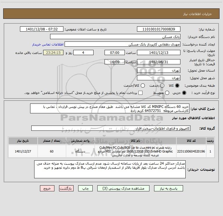 شرح کلی نیاز: خرید 60 دستگاه MINIPC کد کالا مشابه می باشد طبق مفاد مندرج در پیش نویس قرارداد ، تماس با کارشناس مربوطه 64572751 کریم زاده
