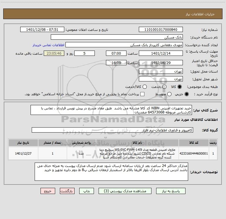شرح کلی نیاز: خرید تجهیزات امنیتی NIBN کد کالا مشابه می باشد طبق مفاد مندرج در پیش نویس قرارداد ، تماس با کارشناس مربوطه 64573068 صفدریان