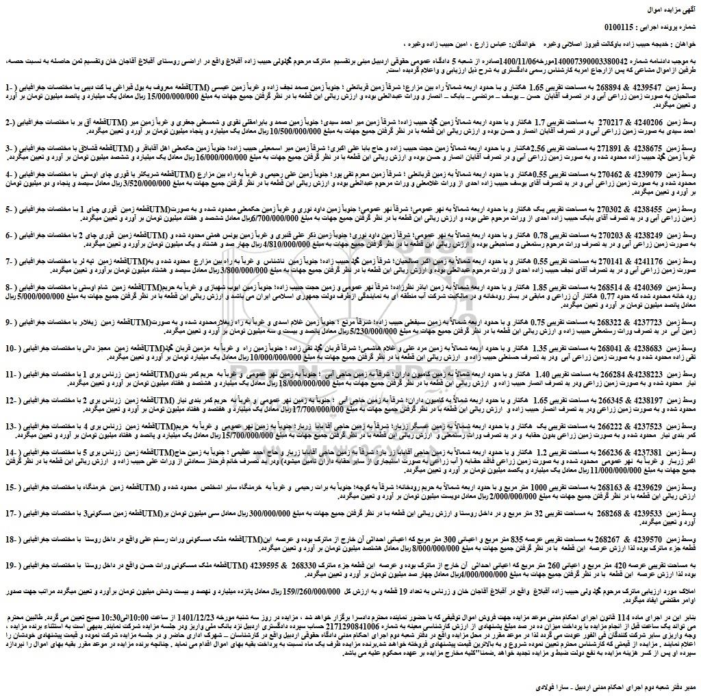 ،به موجب دادنامه شماره 140007390003380042مورخه1400/11/06صادره از شعبه 5 دادگاه عمومی حقوقی اردبیل مبنی برتقسیم  ماترک مرحوم محمدولی حبیب زاده آقبلاغ واقع در اراضی روستای آقبلاغ آقاجان خان وتقسیم ثمن حاصله به نسبت حصه طرفین ازاموال مشاعی که پس ازارجاع امربه کارشناس رسمی دادگستری به شرح ذیل ارزیابی و واعلام گردیده است.