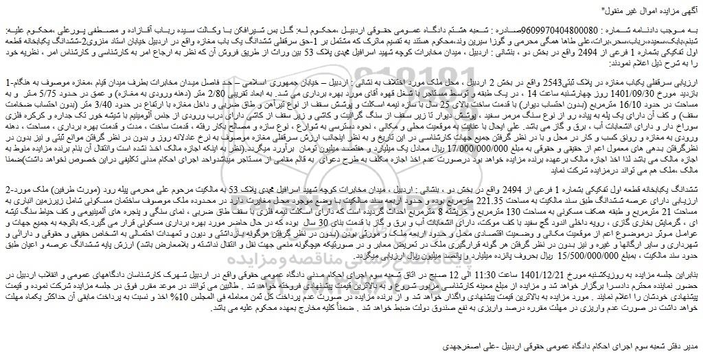 مزایده فروش سرقفلی یکباب مغازه در پلاک ثبتی2543 -ششدانگ یکبابخانه , مزایده فروش سرقفلی یکباب مغازه در پلاک ثبتی2543 -ششدانگ یکبابخانه