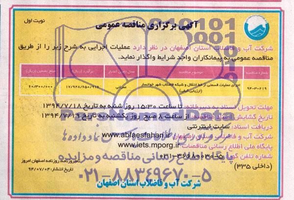 شرکت آب و فاضلاب استان اصفهان درنظردارد عملیات اجرایی به شرح زیر را از طریق مناقصه عمومی به پیمانکاران واجد شرایط واگذار نماید