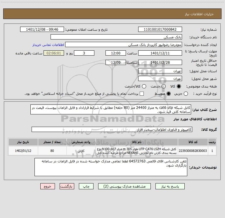 استعلام کابل شبکه cat6 utp به متراژ 24400 متر (80 حلقه) مطابق با شرایط قراراداد و فایل الزامات پیوست. قیمت در سامانه کلی قید شود., استعلام کابل شبکه cat6 utp به متراژ 24400 متر (80 حلقه) مطابق با شرایط قراراداد و فایل الزامات پیوست. قیمت در سامانه کلی قید شود.