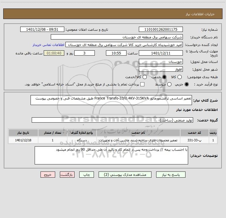شرح کلی نیاز: تعمیر اساسی ترانسفورماتور France Transfo-33/0.4KV-315KVA طبق مشخصات فنی و خصوصی پیوست