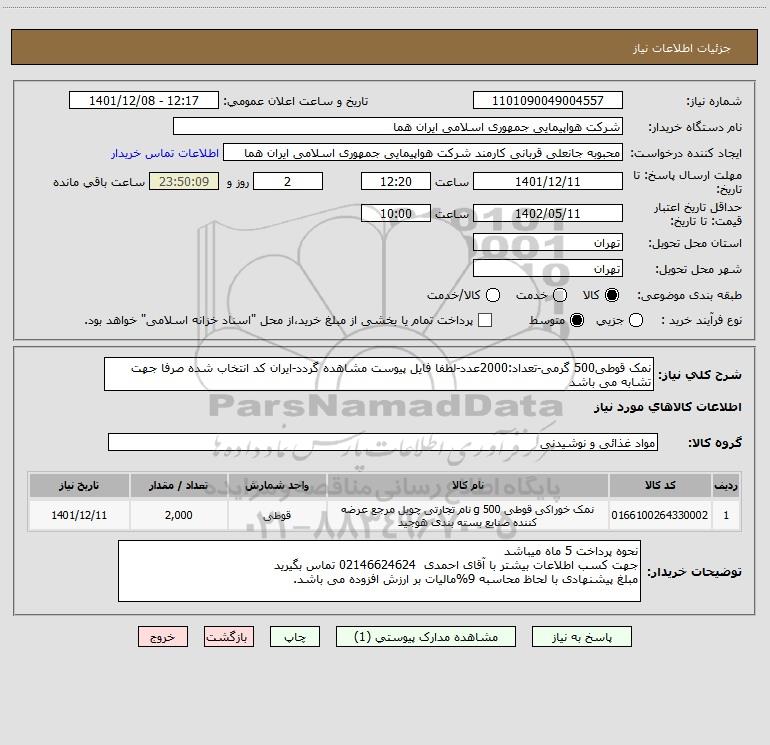 شرح کلی نیاز: نمک قوطی500 گرمی-تعداد:2000عدد-لطفا فایل پیوست مشاهده گردد-ایران کد انتخاب شده صرفا جهت تشابه می باشد