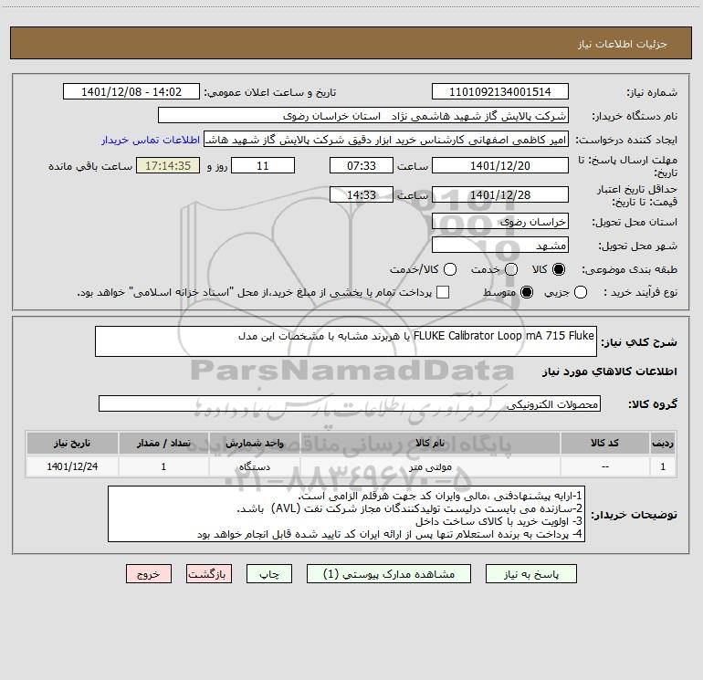 نام دستگاه خریدار:شرکت پالایش گاز شهید هاشمی نژاد استان خراسان رضوی